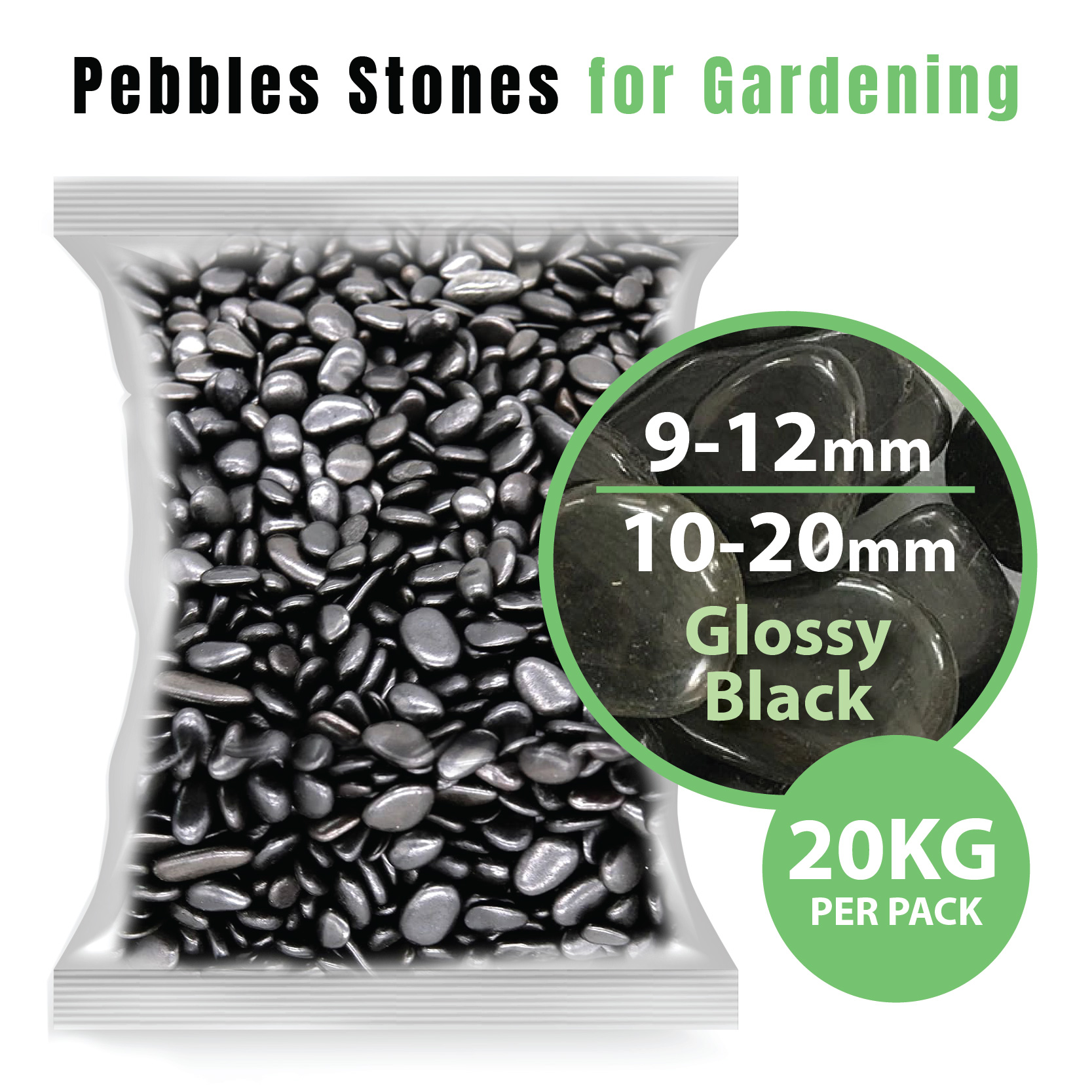 Pebbles & Stones for Gardening (Glossy Black 20Kg) – 9~12mm | 10~20mm