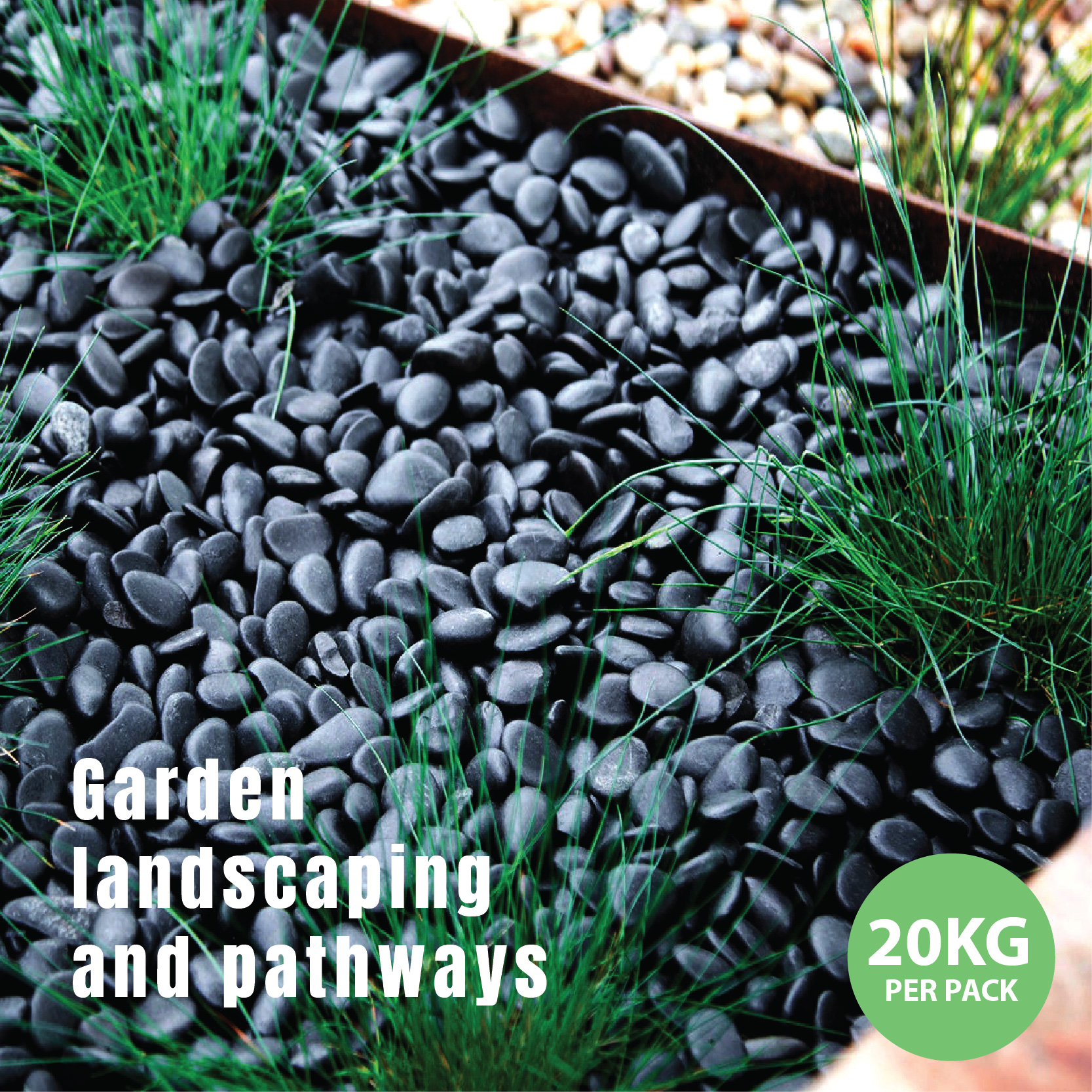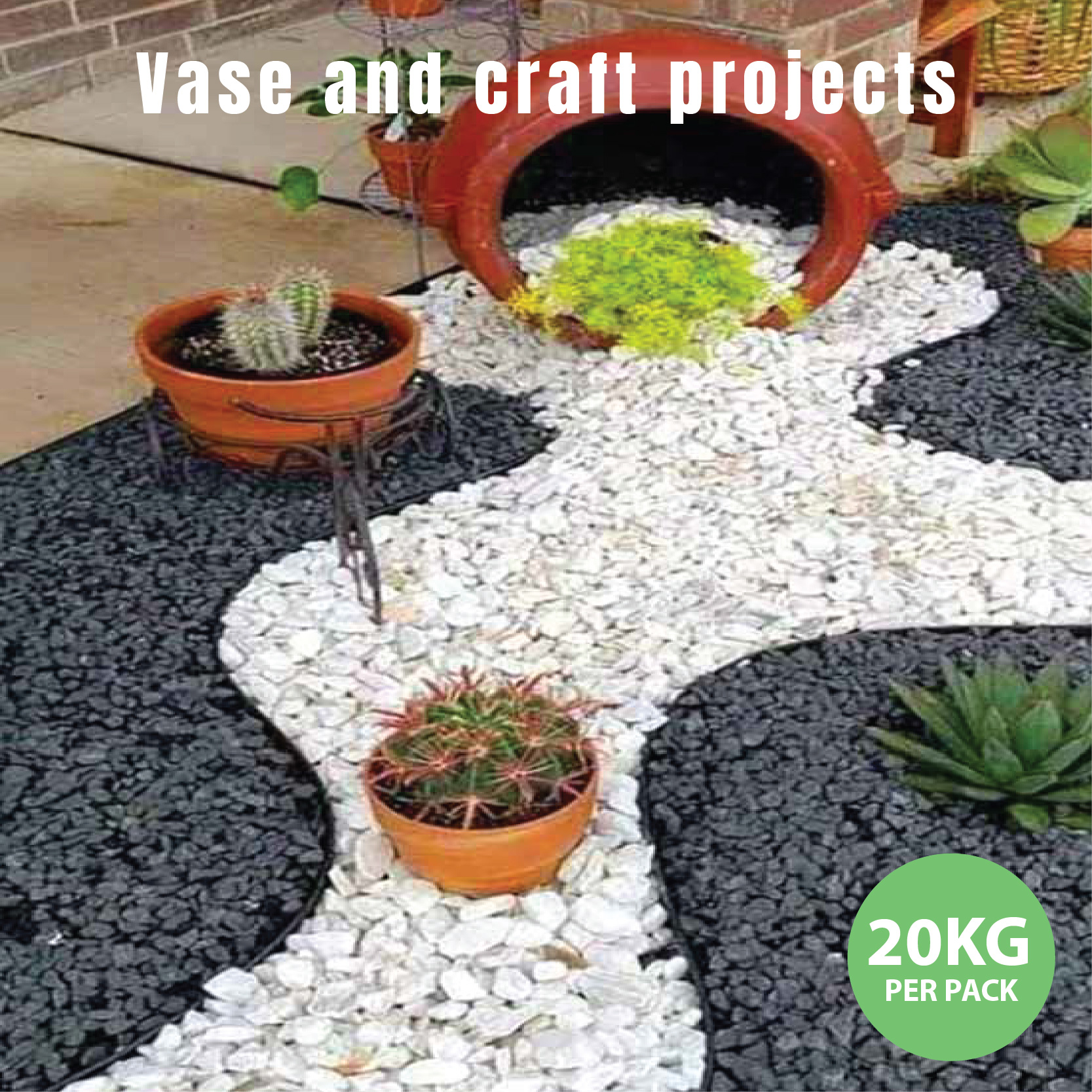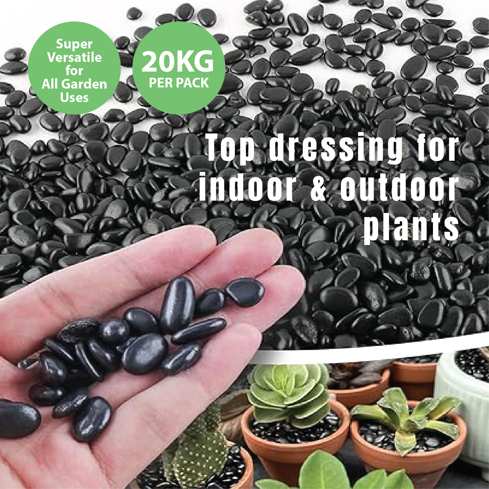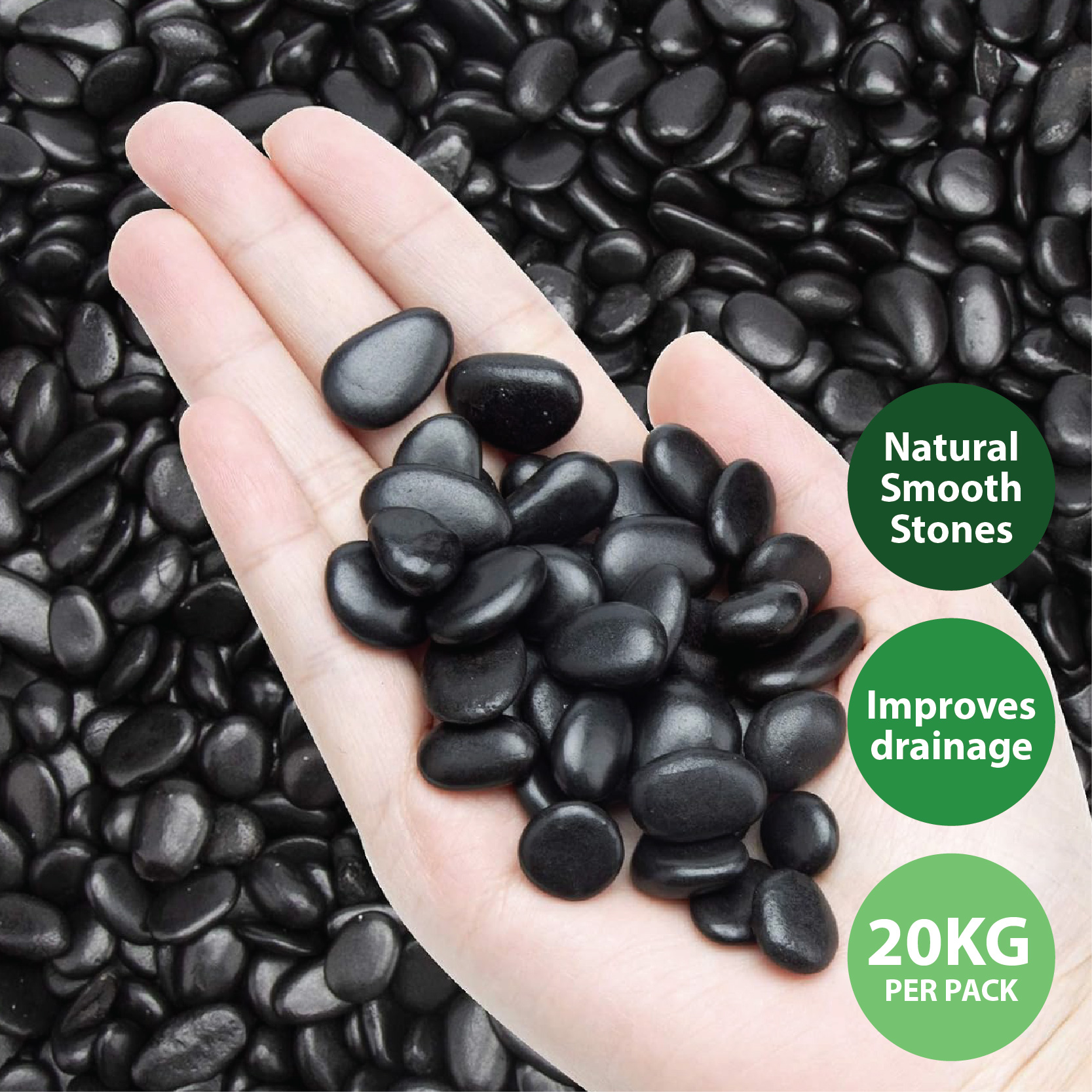 These pebbles are commonly used for garden beds, pathways, potted plants, terrariums, aquariums, water features, and indoor displays. They help improve drainage, reduce soil erosion, and suppress weeds when used as a ground cover. Durable and long-lasting, they maintain their colour and shine even under outdoor conditions.